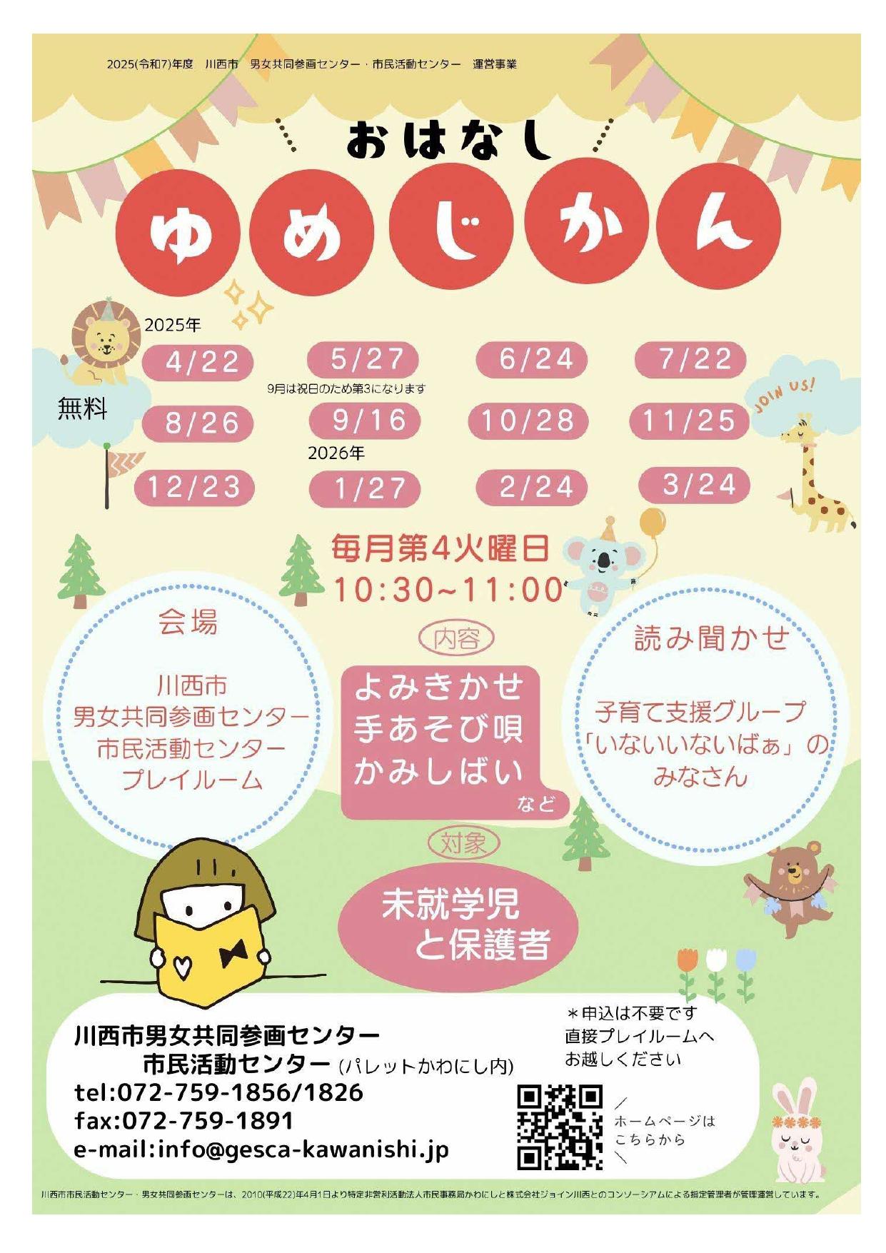 絵本の読み聞かせ、手あそび唄、紙芝居など、親子で楽しく過ごしませんか。